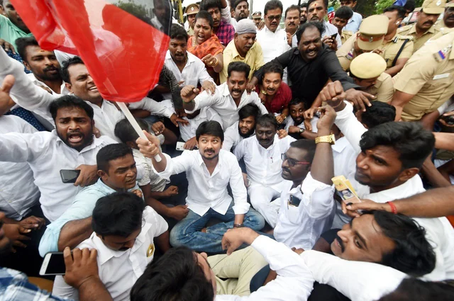 சட்ட நகலைக் கிழித்தெரிந்து போராட்டத்தில் ஈடுபட்ட, உதயநிதி ஸ்டாலின் உள்ளிட்ட தி.மு.க இளைஞரணி நிர்வாகிகள், தொண்டர்களை போலிஸார் கைது செய்து சென்னை நந்தனம் ஒய்.எம்.சி.ஏ வளாகத்தில் சிறை வைத்தது காவல் துறை.
